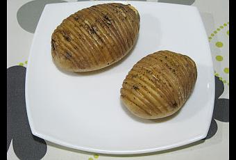 - Atraviesa la parte inferior de las patatas (a lo largo) con un pincho de madera para pinchos morunos, de forma que haga tope y puedas cortar la patata en rodajas finas sin que llegue a cortarse del todo.