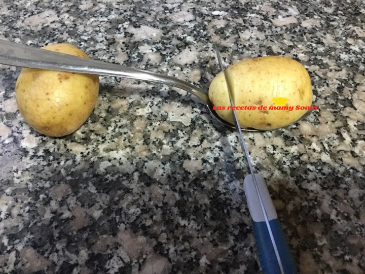 Comenzamos cortando las patatas con la ayuda de una cuchara del tamaño de las patatas
