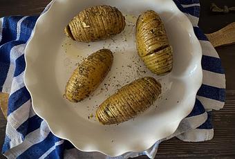 Si estás cansad@ de preparar siempre la misma guarnición para tus carnes o pescados, toma nota de cómo preparar este acompañamiento porque es perfecto. La peculiaridad que tiene es la forma de acordeón que toman las patatas tras los cortes oportunos así como la cocción uniforme y el característico sabor que las impregnan. El origen de estas patatas, hasselback potatoes, se remonta a los cincuentas. Fueron creadas por el aprendiz de cocinero Leif Ellison del Restaurante Hasselbacken en Djurgarden en Estocolmo.