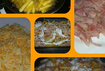 Cogemos una fuente apto para el horno y colocamos las patatas fritas, ponemos salsa ranchera al gusto, le incorporamos las tiras de beicon y la mezcla de queso rallado. Introducimos en el horno para gratinar, hasta que el queso se haya derretido. Listas para comer, están deliciosas.
