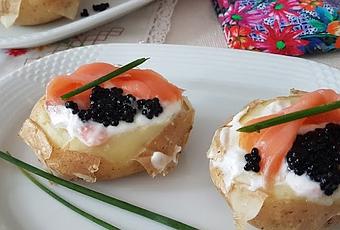 - Rellenamos la patata con la mezcla de queso y salmón y decoramos con el salmón reservado y las huevas de lumpo.