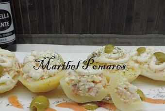 4 patatas medianas.100 grs. Patatas (lo que hemos vaciado).2 huevos duros.100 grs. Salmón ahumado.50 grs. Queso philadelphia. Eneldo.