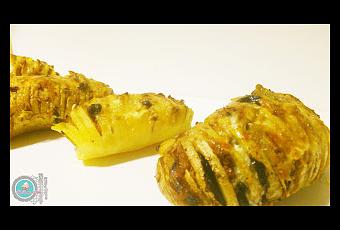 Hervimos las patatas en agua, hasta que estén medio hechas, no las herviremos mucho porque luego hay que terminar de hacerlas en el horno. Y una vez hervidas las patatas insertamos en la superficie un pincho y empezamos a cortarlas en rodajas. (el pincho sirve para que al cortar no lleguemos al fondo con el cuchillo ).