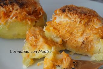 Conforme vamos vaciando las patatas las vamos poniendo en una fuente, la patata que vamos sacando la iremos poniendo en otra fuente.Chafamos con ayuda de un tenedor la patatas que hemos sacado, añadimos el atún escurrido, tomate frito, queso rallado, sal y pimienta.Lo mezclamos y probamos por si os gusta con más tomate o atún, ha de quedar sabroso. Rellenamos con esta mezcla las patatas, las llenaremos bien, las cubrimos con queso rallado y las metemos al horno a gratinar.