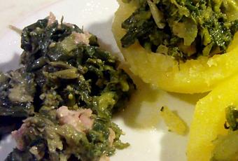 Cuando las patatas estén listas, quitar la piel, cortar por la mitad y con una cucharita, sacar la parte central, formando un barquito. Mezclar la patata con brócoli y longaniza, untar la patata con mostaza y rellenar con el compuesto.