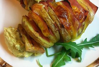 Se precalienta el horno a 180ºC. Mientras se calienta, se lavan y secan las patatas. Se toma un cuchillo afilado y se cortan láminas en la patata, sin llegar al final, para que quede como un libro.
