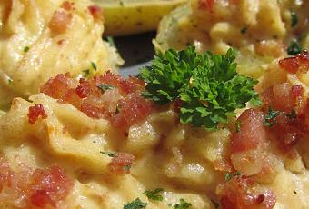5- Rellenar con una manga pastelera o una cuchara, espolvorear con el bacon reservado y perejil. Hornear (180º) unos 15-20 minutos y servir calientes.