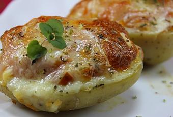 1- Lavar bien las patatas, colocar en la cubeta, (Que quepan en el fondo, si no, en dos tandas no se podrán hornear después). Cubrir con agua y sal, válvula cerrada, menú guiso 15 minutos, 130º, media presión. Refrescar con agua fría, dejar enfríar, cortar en dos mitades, vaciar. Reservar relleno y cascos.