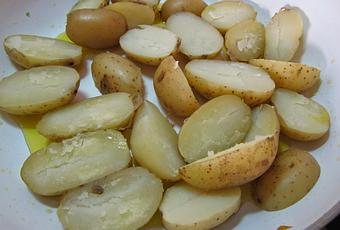 Vamos a hervir las patatas hasta que se queden hechas pero no muy blandas.Las partimos por la mitad y las ponemos a saltear con un poco de aceite de oliva.