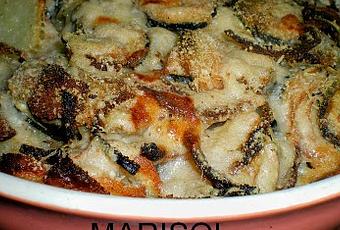 Esta rica combinacion acompaña estupendamente a carnes y pescados. Ingredientes2 patatas partidas en laminas finas2 calabacines partidos en laminas finas200 gramos de queso en polvo1 c.s. de oregano4 c.s. de aceite de olivasal En una fuente resistente al horno, ponemos alternando todos los ingredientes. Introducimos la fuente en el horno a 180º hasta que la patata y el calabacin esten tiernos y la superficie dorada.