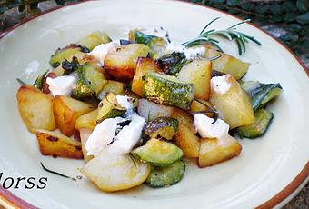 Ingredientes para 2 personas:250-300 gr. de patatas 1 calabacín mediano80-100 gr. de queso de cabra en ruloRomero frescoSal, pimienta negraAceite de oliva virgen extraPelar la patatas y cortarlas en dados de bocado, ponerlas en una sartén con aceite, salar y freir a fuego medio-bajo durante unos 15 minutos.
