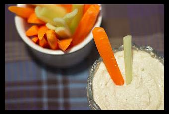 2 cucharadas de tahini (pasta de sésamo)1 cucharada de aceite de oliva1 vaso de agua1 ajo pequeñoSal, pimienta y comino1 trozo de alga Kombu (opcional)Zanahoria, apio y pepino para servir
