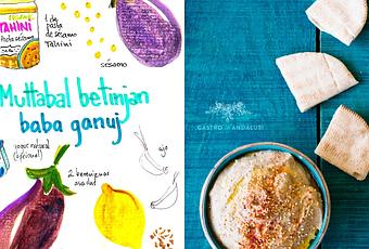 Procedimiento; Partimos por la mitad las berenjenas y les hacemos unos cortes con el cuchillo. Las metemos en el horno a 180º durante 30-40 minutos. Mientras en el baso de la batidora ponemos el zumo del limón, los ajos, los comino, la sal, el tahini y el aceite de oliva virgen extra. Cuando las berenjenas estén listas, esperamos que se enfríen, retiramos la piel y añadimos la "carne" al vaso de la batidora. Batimos la mezcla hasta que quede una textura cremosa. Si nos gusta mas suave, le podemos incorporar unas cucharaditas de yogur hasta que quede más cremoso. Para decorar usamos pimentón, aceite de oliva y sésamo al gusto. Servir junto con pan de pita.