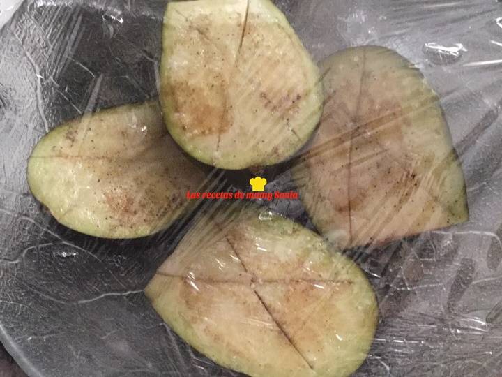 Cortamos la berenjena transversalmente por la mitad, hacer unos cortes en cruz.