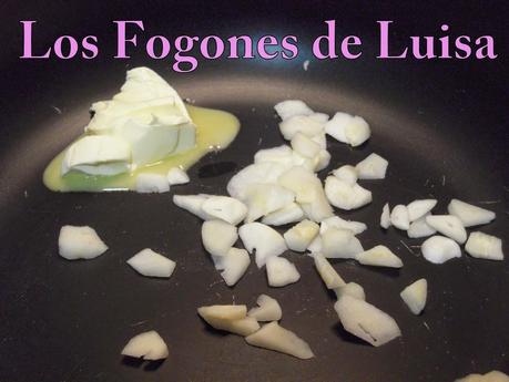 2.-En una sarten (mejor un poco honda) ponemos la mantequilla y los ajos a trozos y dejamos que se doren (cuidado que no se quemen)