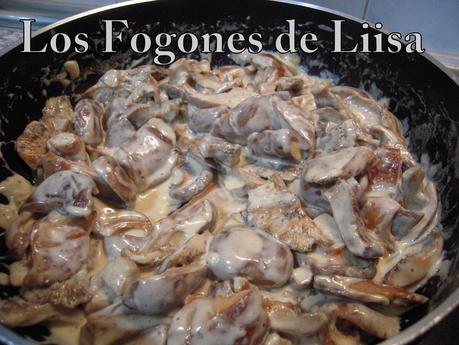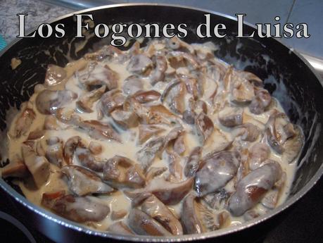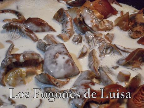 4.- Cuando estén los Niscalos un poco hechos, le echamos la nata, removemos y dejamos que se reduzca a la mitad, dando vueltas de vez en cuando, también le pusimos un poco de sal y pimienta recién molida