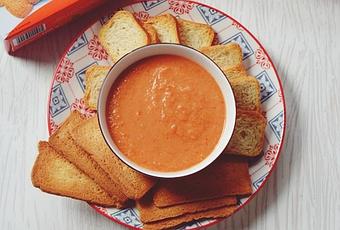 Nosotros hemos disfrutado de estas tostadas acompañándolas con este delicioso y fácil paté de pimientos con nueces. Es una receta que nos ha encantado, con un sabor a pimientos y con el toque de las nueces, es absolutamente delicioso, parecido a un hummus pero con una textura más ligera.