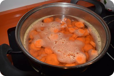 Raspa las zanahorias y corta en rodajas. Cuece en abundante agua con sal. Alrededor de 10 minutos.