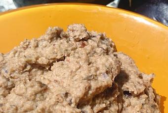 ♥ 1 berenjena♥ 2 dientes de ajo♥ 1 cdta de aceite vegetal♥ 50g de piñones♥ sal♥ pimienta♥ 1 cda de cebolla frita- Picamos el ajo y lo sofreímos con un poco de aceite. A continuación agregamos los piñones y salteamos unos dos minutos más. Añadimos la berenjena cortada en dados y seguimos salteando hasta que se ablande. Añadimos ña cebolla frita y salpimentamos. Trituramos todos los ingredientes y enfriamos antes de servir.