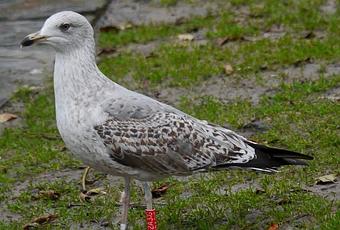 Por otro lado, el 2 de enero de 2014, estaba paseando por la plaza del Niemeyer y observando las gaviotas que se agrupan en la campa que está junto a ella cuando localicé una nueva gaviota anillada, ésta local, un 3º invierno.