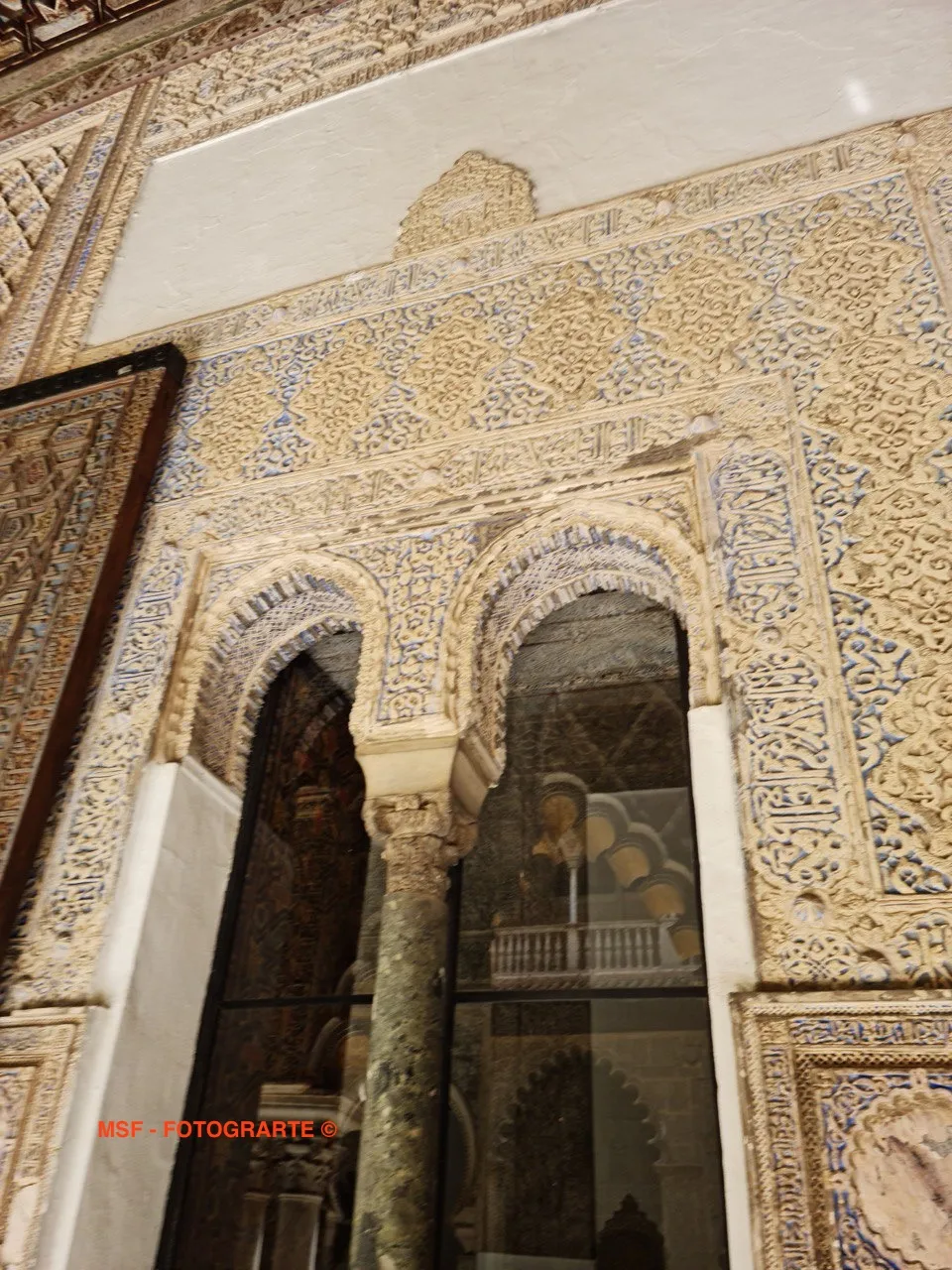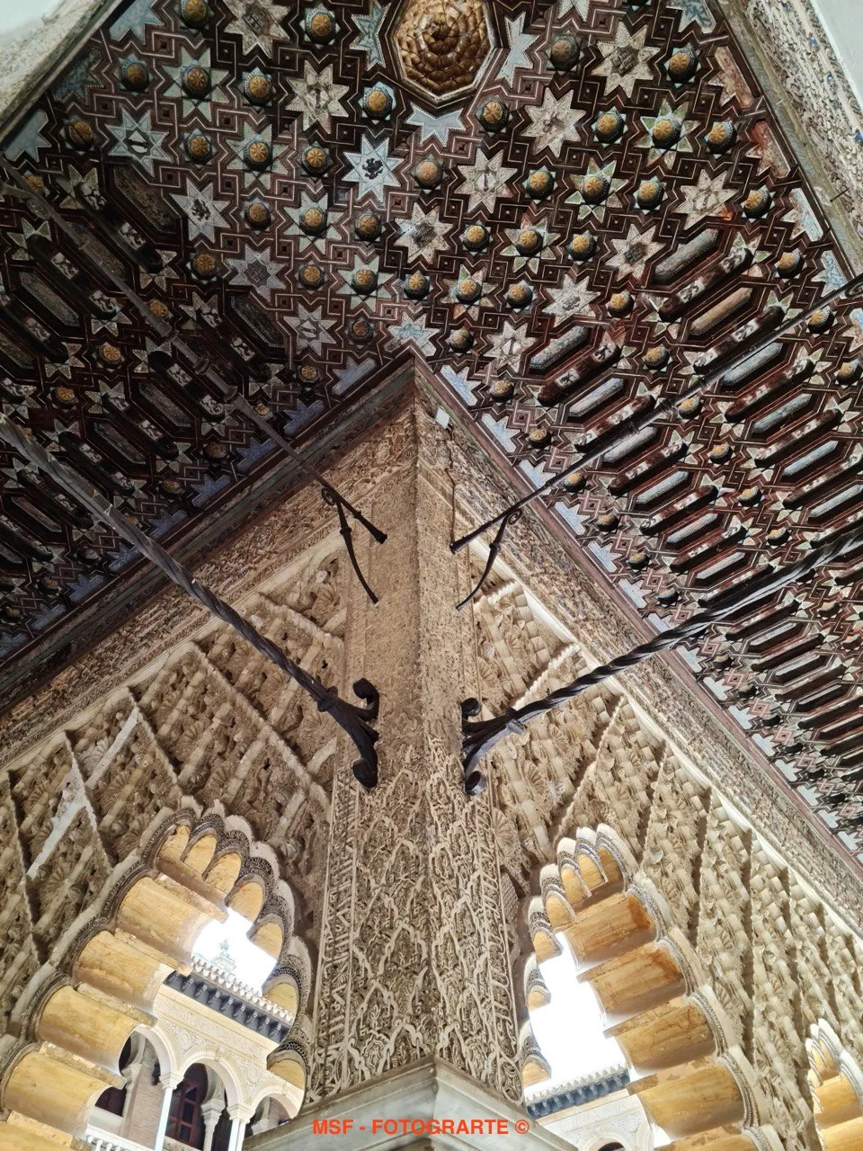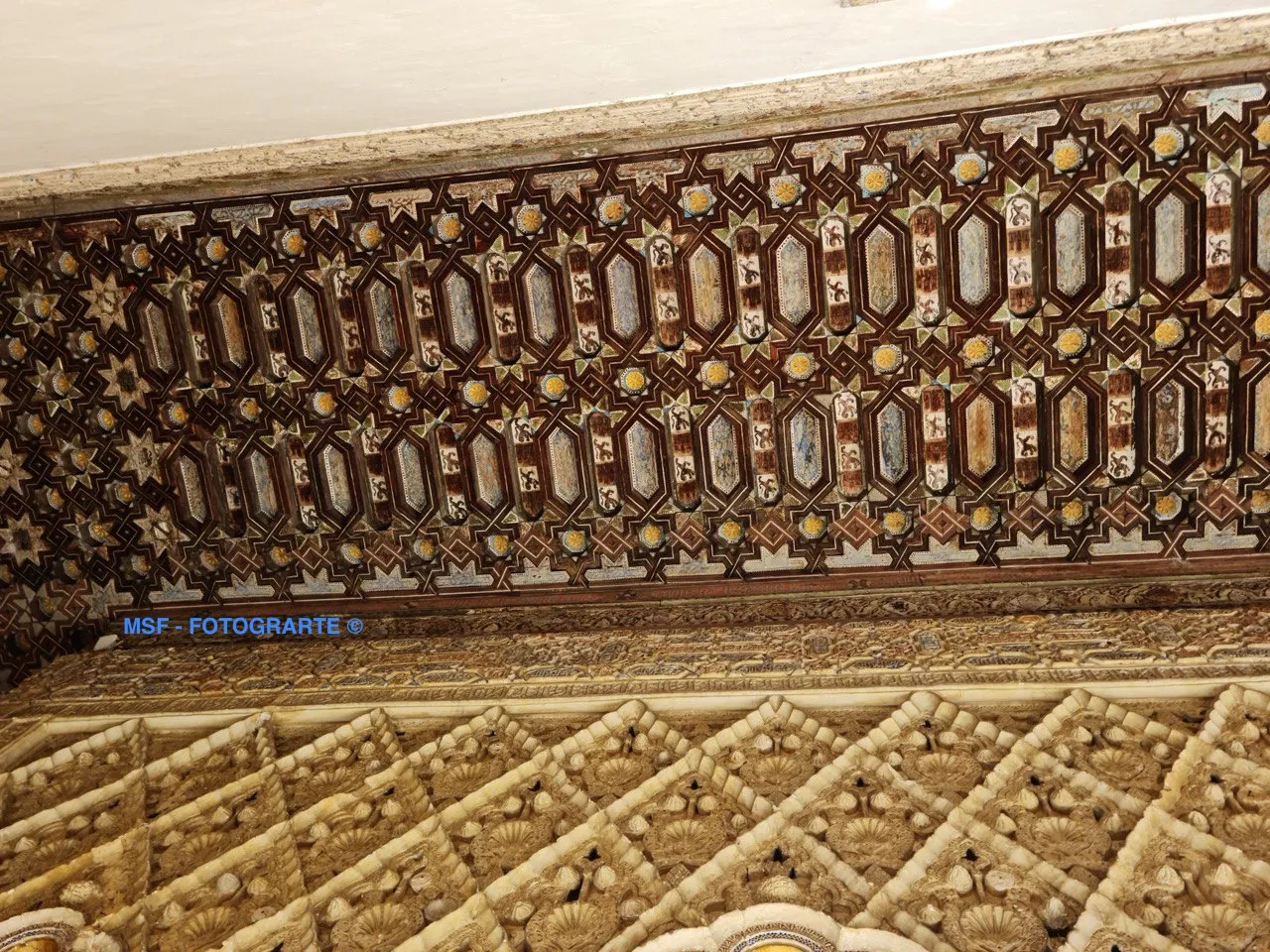 Otro detalle del artesonado del techo, donde pueden verse de una manera más clara las estrellas, típicas del estilo almohade. También pueden verse las conchas en la pared y los arcos polibulados, todo ello típico de este estilo del arte del período musulmán medieval español. / Another detail of the coffered ceiling, where the stars, typical of the Almohad style, can be clearly seen. Also visible are the shells on the wall and the polybulated arches, all typical of this style of art from the medieval Spanish Muslim period.