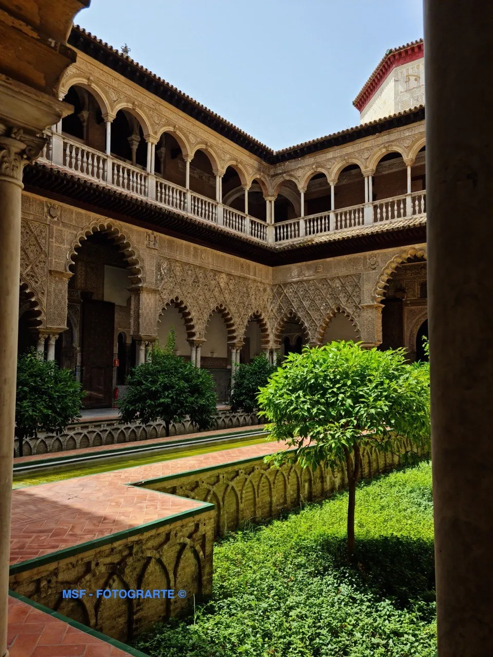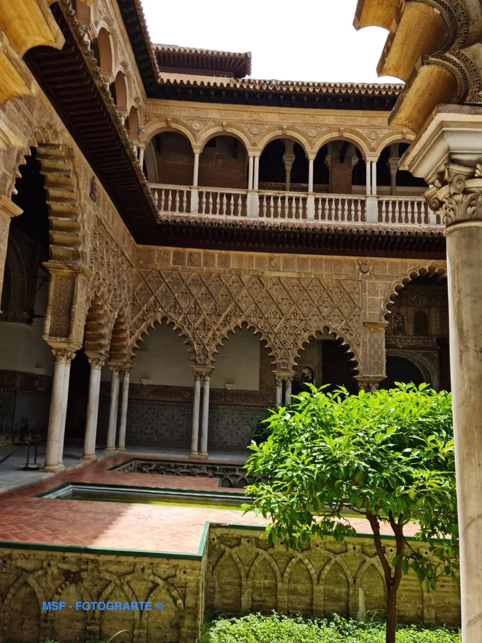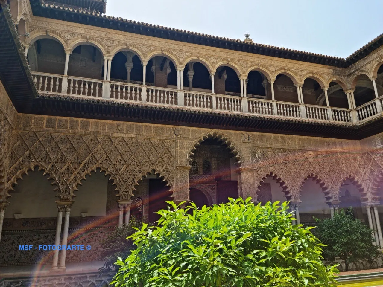 This courtyard was the center of the public space of the Palace of King Pedro I. The original 14th-century work corresponds to the lower gallery. This magnificent space is surrounded by a gallery of multi-lobed arches, one of the most characteristic decorative motifs of the Almohad dynasty, along with the decoration of the sebka panels. The shell (a symbol of fertility and life), the Hand of Fatima (a symbol of protection), geometric ribbon compositions, schematic plant decoration, and Kufic-style Arabic epigraphic cartouches complete the ensemble. The coats of arms of the Spanish monarchs crown this gallery.