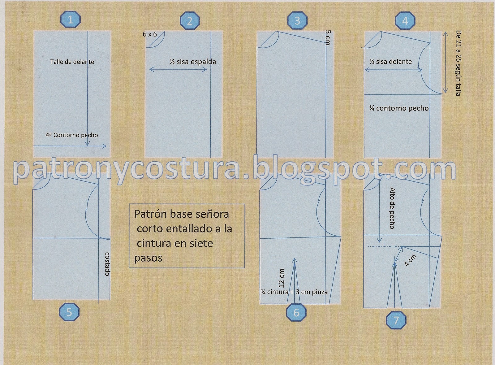 Necesitamos un material básico:Cinta métrica, Papel manila o seda, Regla de 60 cm,Lápiz.Tenemos presente siempre las medidas para las que elaboramos el patrón.Ver cómo tomar bien las medidasYo siempre sigo el mismo orden y hago los siguientes cálculos:Cuello: dividimos entre 6.Talle 1º : que es el de la espalda.Talle 2º : de delante.Sisa de delante: esta se divide entre dos y el resultado lo ponemos en el patrón.Sisa de detrás: suele ser 2 cm más que la de delante y también la dividimos entre dos.Alto pecho: tal cual.Contorno de pecho: cantidad que dividimos entre cuatro.