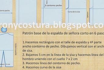 Contorno de cadera: también la dividimos entre cuatro.Largo: tal cual, el deseado.Espalda 1.Se comienza haciendo un rectángulo que mida el largo del talle, y el ancho de la 4ª parte del contorno de pecho. Después, en el ángulo superior derecho dibujamos el escote La bajada de sisa va en función de la talla de cada una, la talla la hallamos dividiendonuestra cintura entre 2 Ejemplo: nuestra cintura mide 80:2= 40 es nuestra talla. 4. Y unimos en curva suave con la línea del hombro,
