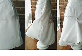 Este tipo de falda lleva un botón a la altura de la cadera, centrado en la espalda y en el costado derecho una presilla para abrocharlo, de este modo no lo pisa y no molesta. En la base del otro costado lleva una goma para insertar la bota, pues la falda no debe tener movimiento con la velocidad del caballo, ha de estar bien sujeta.