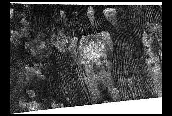 Estos patrones tan familiares sobre las dunas de Titán ya habían sido observados con anterioridad, pero esta nueva imagen, tomada por el radar de Cassini el día 10 de julio de 2013, los muestra con un nivel de detalle sin precedentes. La línea horizontal en el centro de la imagen es producto del procesado de las imágenes radar.
