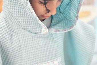 - Tela principal (para el poncho y la capucha): 1 metro tela con un ancho de 150 cm. Recomendamos usar tejido de rizo de toalla o tela de waffle, ambos 100% algodón para asegurar una buena absorción.