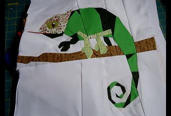 Janeen se inspiró en un camaleón de su hijo para crear el bloque.El resultado final es 40x40cm que será publicado en su revista Paper Piecing 1/4 Digital Magazine.