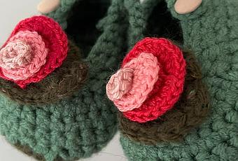 Estos patuquetes se hacen con mucho cariño para que lleve el pie lo más confortable posible. Realizado en dos tonos de verde, uno para la suela y otro para el resto. Va rematado con una rosa grandecita y se cierra como si fuera una mercedita, para que no pierda el patuquin.