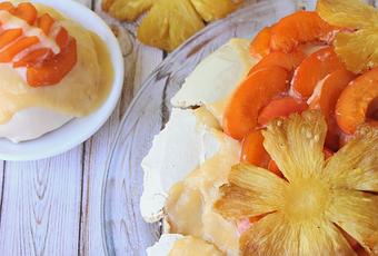 Una de las características de la pavlova es principalmente, su acompañamiento de fruta. Tradicionalmente se hace con frambuesas, fresas, moras... y, a veces, ralladura de chocolate, sobre una capa de nata montada. Yo he querido darle mi toque personal, añadiendo dos de mis frutas favoritas: la piña y el albaricoque.
