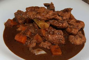 Pasamos enseguida a un plato, colocando la carne con las verduras y después salseando con un poco de chocolate. Espero que os animéis a prepararlo, porque el sabor es alucinante.