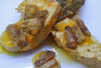 Segundo. Partimos la cebolla en cuadraditos chicos y la cocinamos en abundante aceite. Cuando esté casi transparente, pasaremos a sellar las pechugas de pavo. Para ello, le echaremos las especias correspondientes a la carne (sal, ajo y pimienta) y la posaremos encima de la cebolla durante unos minutos por una cara y otros tantos por la otra.