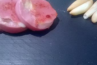 Lo primero que vamos a hacer es coger la barra de pavo y hacer un agujero redondo en medio sin llegar a romper la parte de abajo y con lo que sobre lo dejamos ahora a un lado. Después en la base echamos el pate de langostino. Cortamos el rulo de cabra, quitamos los bordes y lo ponemos encima del pate. Ahora cogemos lo que nos ha sobrado del pavo y lo ponemos encima del queso. Ya tenemos preparado nuestro pavo. Es el momento de coger la sartén y sin aceite ponemos el pavo con la parte que hemos cortado hacia abajo para que cuando empiece a calentar el pavo la parte de arriba se pegue con el queso y después le damos la vuelta para que se haga por el otro lado.