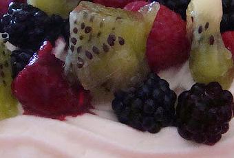 Su base esta elaborada con un merengue cocido, que queda crujiente por fuera y suave y ligero por dentro, y su cobertura es de nata montada y frutas frescas.
