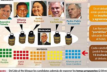 Percy Medina, Secretario Ejecutivo de Transparencia, una de las entidades organizadoras del próximo debate, informó que la ubicación de los candidatos será de izquierda a derecha: Alejandro Toledo (PP), Keiko Fujimori (Fuerza 2011), Ollanta Humala (GP), el moderador, Luis Castañeda Lossio (SN) y Pedro Pablo Kuczynski (AGC).Como se sabe, el debate se realizará el domingo 3 de abril a las 7:00 pm, en el Hotel Sheraton, y el moderador será José María “Chema” Salcedo. Se prevé que tendrá una duración de 3 horas y se dividirá en 5 bloques: visión del país, lucha contra la pobreza, generación de empleo, seguridad y narcotráfico, y una intervención final. Cabe indicar que los candidatos no podrán portar ningún logo en su vestimenta, ni portar materiales de campaña de ningún tipo.Medina también informó que cada candidato tendrá opción de llevar 15 invitados que se ubicarán en el mismo orden que el escenario. Un aproximado de 150 periodistas acreditados estarán ubicados en una sala contigua desde donde podrán seguir las incidencias del encuentro.La transmisión para televisión será realizada por un equipo especialmente contratado para la ocasión que distribuirá las imágenes gratuitamente a todos los canales que lo requieran.CANDIDATOS DEBEN TENER “CORREA”Por otro lado, consideró que el debate “requerirá a los candidatos mucha correa para aceptar las preguntas y utilizar el escenario a su favor”. Sostuvo que las preguntas y respuestas permitirán a los candidatos mostrar cuánto conocen de sus propios programas y qué capacidad tienen para convertir esas propuestas técnicas en frases y enunciados que comuniquen al ciudadano de a pie y no al analista. “Cuánto los candidatos serán capaces de comunicarse con la gente común y corriente”, precisó.Agregó que el debate será importante porque permitirá ver las diferencias en las propuestas de los candidatos. Indicó que será un “debate programático”, que permitirá comparar la consistencia de las propuestas”. Finalmente, rescató que todas las decisiones sobre las características del debate se han tomado por consenso: lugar, moderador, fecha, metodología, entre otros. “Las negociaciones han sido bastante amigables, los voceros han estado muy abiertos a escuchar los puntos de vista de los otros y a respetarlos”, dijo.