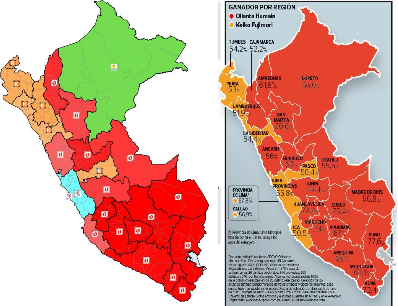 Ya lo dije en el post anterior, ahora comienza una nueva era en nuestro país y sí mis amigos esto se ve reafirmado cuando ya todos sabemos que casi los resultados están definidos, ahora debemos ver el nuevo mapa de nuestro Perú, haciendo un análisis de las regiones que favorecieron a determinado candidato comparar estos resultados con el mapa obtenido en el 2006 y con el mapa obtenido en la primera vuelta y veremos que hay algunos leves cambios que mostrare a continuación:PRIMERA VUELTA 2011 VS SEGUNDA VUELTA 2011: Sorprendentemente, el mapa de segunda vuelta no cambio casi nada con respecto al de la primera vuelta, el traspaso básico de votos que ya había dicho antes ocurrió y en resumidas cuentas esto hizo al final que pocas regiones cambiaran de manos pues en si Humala siguió fuerte en el sur, centro (Excepto Pasco) y en la Selva (Excepto Loreto). Keiko Mantuvo su supremacía en el norte, entonces las regiones que cambiaron de manos fueron: 1.Loreto: En primera vuelta Toledo Gano en ella, ahora esta plaza importante de la amazonia paso a manos del Nacionalismo, cosa que era logia al verse el endose de votos de Toledo hacia Humala.2.Cajamarca: Bastión importante del fujimorismo durante la década del 90, en primera vuelta volvía a ratificarse esta como una tradicional plaza Fujimorista, pero en la segunda vuelta y para sorpresa de muchos ha pasado ser parte del Humalismo. Entre los factores que determinan este cambio de manos está la fuerte presencia de grupos anti mineros que apoyaron a Humala en la segunda vuelta y el trabajo del presidente regional Cajamarquino del Movimiento Regional MAS, quien en más de una oportunidad ha declarado su acercamiento ideológico con el nacionalismo.3.Lima Metropolitana y Callao: En la primera vuelta fueron los bastiones más fuertes de la Alianza Por El Gran Cambio que lidero PPK. Aquí durante la primera vuelta era lógica la victoria de PPK, pues un miembro activo de esta alianza era el PPC y todos sabemos que la presencia municipal del PPC es grande y esto ayudo a PPK. En segunda vuelta, la capital se volvió la región que mas voto por Keiko, luego que el candidato PPK, decidiera apoyar a Keiko.4.Ica: Si bien la lógica nos diría que esta región al estar al sur del país debería ser bastión Humalista, no es así el fujimorismo ya tenía una fuerte presencia desde las elecciones regionales, cuando por muy poco el Fujimorismo perdió la presidencia regional. La figura de Eduardo Cabrera Ganoza es importante.Comparacion Mapas Electorales Primera y Segunda Vuelta 2011