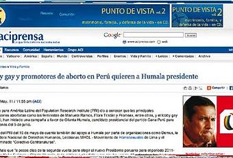“El PRI señala que a pocos días de la segunda vuelta (electoral) para elegir al nuevo Presidente peruano entre Keiko Fujimori y Ollanta Humala, todo el bloque abortista y pro gay ha venido difundiendo simultáneamente, a través de sus webs y cuentas de facebook institucionales, mensajes anti Keiko y a favor de Ollanta”, publicó ACI Prensa el pasado 16 de mayo con el titular: ‘Lobby gay y promotores de aborto en Perú quieren a Humala presidente’.