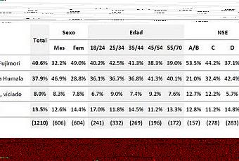 ENCUESTA DATUM: LAS PREFERENCIA POR SECTORESPOR NIVEL SOCIOECONÓMICO. La primera cifra a la vista es que Keiko Fujimori saca una amplia ventaja en el sector socioeconómico A/B, con 53.5%, dejando a Humala con el 21.0% de este sector (*). Allí mismo, el 12.7% votaría en blanco o viciado y el 12.8% no opinó.La otra cara de la moneda se ve en los sectores más bajos. En el D, Humala se impone con 42.4% frente al 37.1% de su rival, mientras en el E obtiene 40.7%, y Fujimori 34.9%. En el nivel C, o la peleada clase media, Keiko también vence con 44.2% frente a 32.4%.POR EDAD. La propuesta de Gana Perú resulta más atractiva entre las personas de mayor edad, según este sondeo, venciendo en los sectores de 45 a 54 años y de 55 a 70 años, posiblemente impulsado por su programa Pensión 65. En cambio, Fuerza 2011 logra imponerse en todos los rangos de edad entre los 18 y 44 años.POR GÉNERO. Otro dato interesante es que la mayoría de mujeres respaldaría a la candidata del mismo sexo, Keiko Fujimori, pues un 49% votaría por ella, frente al 28.8% que haría lo propio por Humala. En el caso de los hombres, 46.6% votaría por el nacionalista y 32.2% por la fujimorista.POR REGIONES. Finalmente, el detalle por las regiones del país también da mayores luces: en Lima y Callao, Fujimori obtiene 45.6% y su rival solo el 28%. La victoria de Keiko se repite en el norte y el oriente del país, aunque de forma más apretada.Por su parte, Ollanta Humala logra sacar una distancia de más de 5 puntos en el centro del Perú, mientras que en el sur la ventaja nacionalista es mucho más clara, con 56.9% frente al 28.7% de Fujimori HiguchiNOTA(*) Las cifras del sector A/B son una corrección a las aparecidas en la versión impresa del diario.