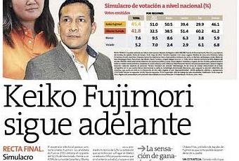 Según las cifras, a nivel de votos válidos, la ventaja de la congresista es abrumadora en Lima y Callao (61.1%) y en el norte (56.7%). El líder nacionalista cuenta con el apoyo contundente del sur (66.8%) y del centro (56.6%).La diferencia entre los dos postulantes se mantiene si se analizan los votos emitidos: Fujimori logra 45.4% y Humala 41.8%. Lo interesante es que el segmento de los indecisos sigue disminuyendo y casi alcanza su promedio histórico de 12%. La población que se inclina por sufragar en blanco se reduce a 7.6% (un punto menos que en el anterior estudio), y la que viciará su voto continúa en 5.2%.La encuesta confirma, asimismo, que la mayoría no cree en los principales ‘caballitos de batalla’ de los candidatos. Por ejemplo, el 60.3% considera que los anunciados cambios al plan de gobierno nacionalista son solo estrategias electorales. Y el 64.5% cree que Keiko sí liberará a su padre, el condenado expresidente Alberto Fujimori.