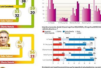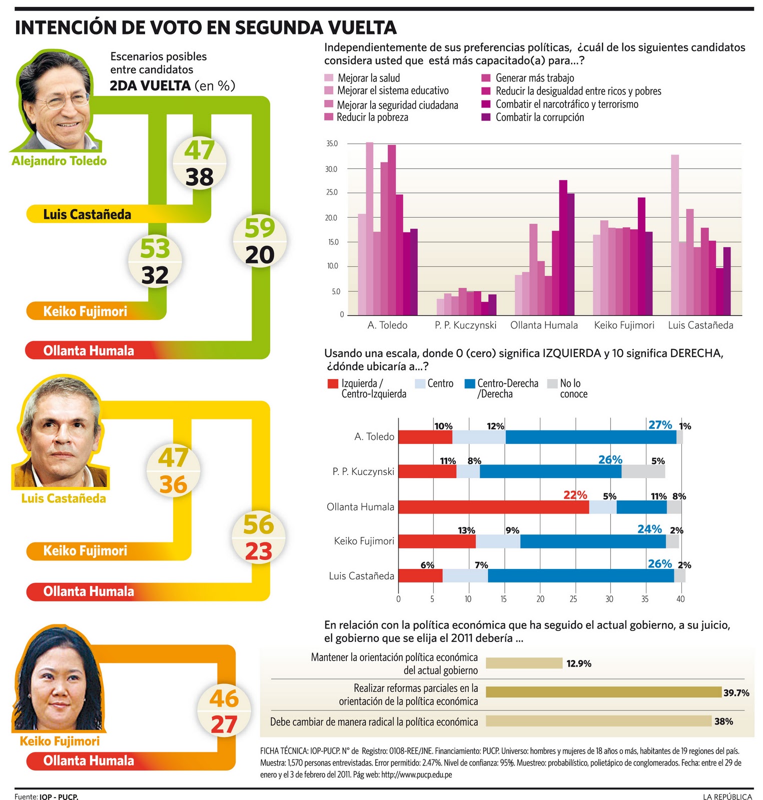 En segunda vuelta electoral, al ex presidente Alejandro Toledo le será más fácil ganar la elección si su contendora es la candidata de Fuerza 2011, Keiko Fujimori, según lo revela la reciente encuesta nacional urbano-rural del Instituto de Opinión Pública de la Universidad Católica. En ese escenario, Toledo, quien intenta volver al gobierno por las filas de Perú Posible, obtiene 53%; mientras que Keiko, 22%, lo que implica 31% a su favor. En cambio, la diferencia se reduce a 9% si en el otro lado de la cancha Toledo tiene como contrincante al candidato de Solidaridad Nacional, Luis Castañeda Lossio. En esta escena, el candidato del partido de la chakana logra 47% y el aspirante presidencial por Solidaridad Nacional, 38%.El que se enoja pierdePara el politólogo Eduardo Toche hay un alejamiento de Toledo del segundo bloque, pero advirtió que ello no es definitivo. Toche consideró además que Toledo comete un error al señalar que va a ganar en la primera vuelta, porque, según dijo, si bien “toma distancia del segundo pelotón, no es seguro que logre el 50% de los votos”.Atribuyó la caída de Castañeda en las encuestas a que este se ha dedicado únicamente a la campaña del ataque contra Toledo.El director del Instituto de Opinión Pública de la Universidad Católica, Fernando Tuesta, encontró difícil que Toledo gane en primera vuelta por la dispersión de los votos. Señaló, además, que una elección no es un concurso de méritos, y que ganará el candidato que logre mayor empatía con los electores.Se dividen los temasMás. Los entrevistados creen que Alejandro Toledo solucionará los temas pobreza, educación y empleo; Luis Castañeda, los de salud y seguridad ciudadana; Ollanta Humala, la corrupción; y Keiko Fujimori, narcotráfico y terrorismo.