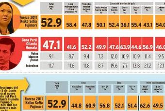 Según el estudio, elaborado el 9 al 12 de mayo entre 2005 entrevistados, la lideresa de Fuerza 2011 logra el 52.9% sobre el total de votos válidos,mientras que el líder nacionalista obtiene el 47.1%. Es decir, Fujimori saca una ventaja de 5.8% puntos sobre su rival.El 9.1% de los encuestados señala que votará en blanco o anulará su voto, mientras que un11.7% aún se muestra indeciso.En la encuesta anterior, elaborada por CPI en abril, los resultados eran prácticamente inversos: Fujimori tenía el 47.5% de intención de voto, mientras que Humala ascendía al 52.5%. El presente estudio también muestra que Fujimori tiene una amplia ventaja en la capital, pues logra una intención devoto del 58.4%, mientras que Humala sólo llega al 41.6%. En la capital, Keiko ha subido casi 6 puntos (tenía 52.7% en abril) y Ollanta ha descendido en igual cifra (tenía 47.3% en abril). La situación se revierte en el interior del país en donde el nacionalista llega al 52.2%, en tanto Fujimori logra el 47.8%. Si desagregamos el estudio por zonas, Fujimori tiene la mayoría en la costa norte (50.1%), la costa sur (55.4%) y la sierra centro (52.4%), mientras que Humala logra imponerse en la sierra sur (63.9%) y en el oriente (56.9%) del país.SUS FUERTES. Pero ¿cuáles son los rubros en los que Keiko sustenta su diferencia? Según la encuesta de CPI, además del voto capitalino que le es ampliamente favorable, la candidata naranja tiene grandes preferencias en las mujeres, pues un 60.9% la respalda. Del mismo modo, un 56.8% de jóvenes de entre18 y 24 años de edad le brinda su respaldo a Fuerza 2011, aunque en el rango de entre 25 y 39 años también tiene elapoyo del 52.1%.