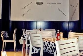 El local es pequeño, con un aforo aproximado de 40 personas, que lo hace acogedor, luz demasiado tenue, para ser un restaurante, decorado con motivos de vaquitas a blanco y negro, mezclado con mobiliario de madera, tal vez algo anticuado.