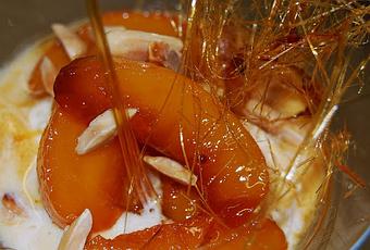Helado de vainilla (AQUÍ) MELOCOTONES EN ALMIBARAzúcar y mantequillaAlmendras tostadas.Caramelo