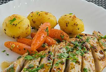 Podemos servir con unas papas risoladas y unas zanahorias que podemos tornear, luego las ponemos a hervir cinco minutos, escurrimos el agua y las impregnamos con un poco de mantequilla, ajo y sal y les damos un toque de horno, en el modo gratinar.