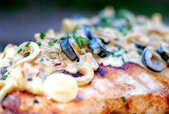 Saca la pechuga de la parrilla, vierte por encima la mezcla de queso, cebollas y aceitunas. agrega los cebollinos cortados por encima, Acompaña con una ensalada verde y un vino tinto con cuerpo, verás que está delicioso!!