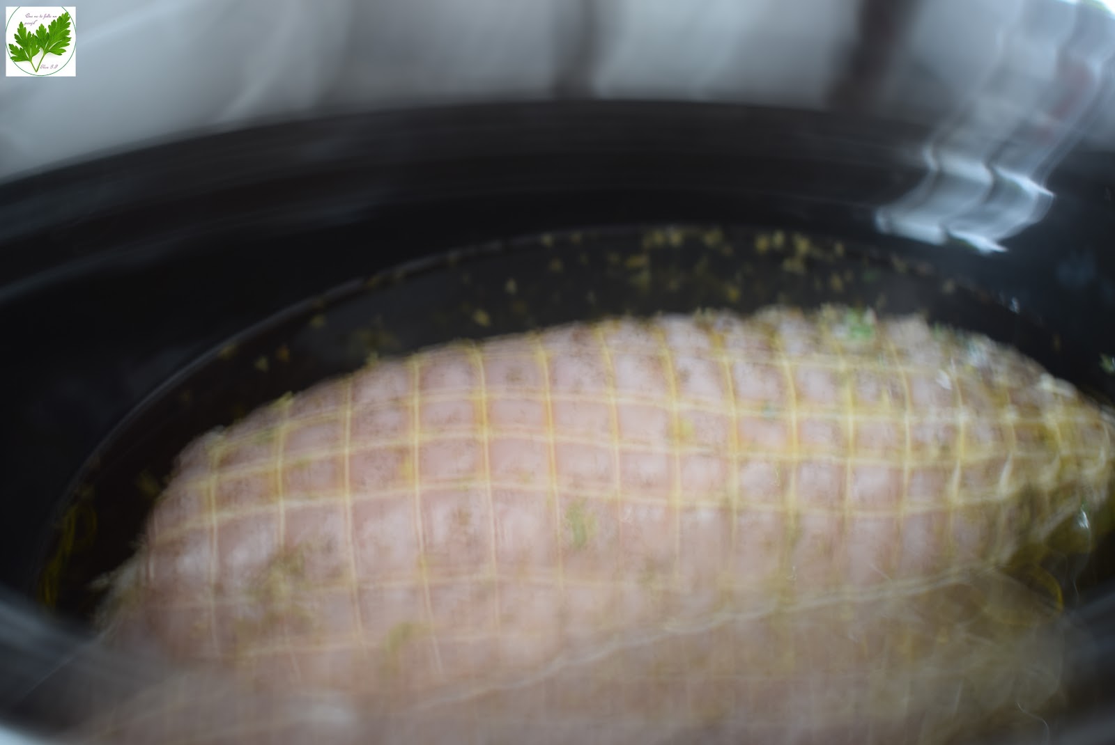 Pon la pechuga dentro de una malla, esto puedes pedírselo a tu carnicero. Coloca la pechuga dentro de la Crock-Pot. Cubre con aceite hasta la mitad. La foto no es muy buena, pero así te haces una idea.